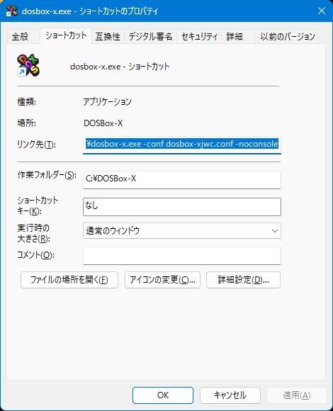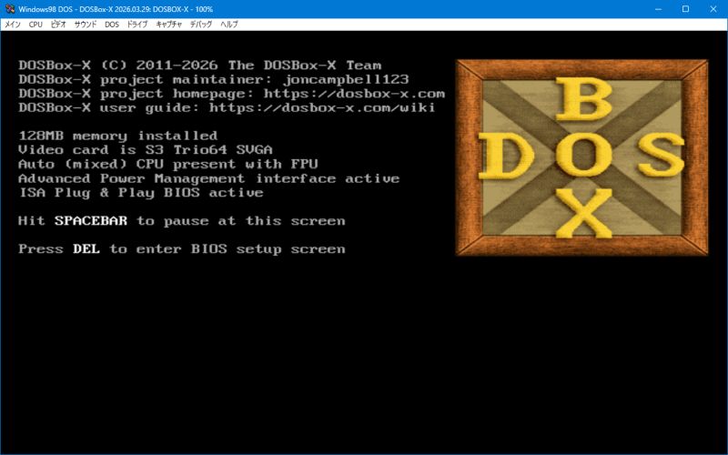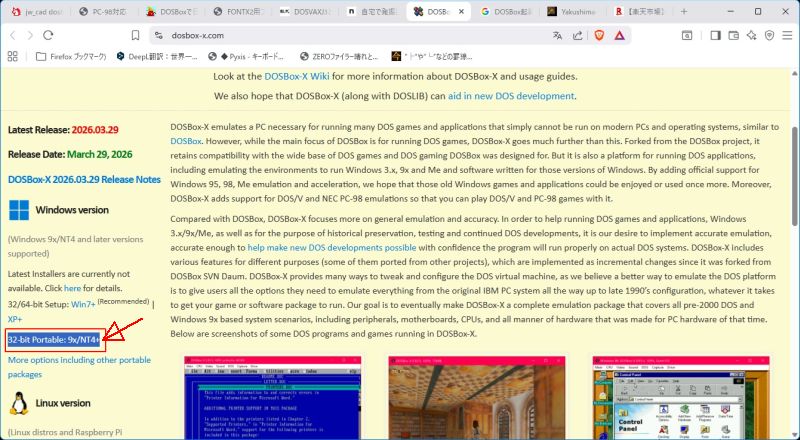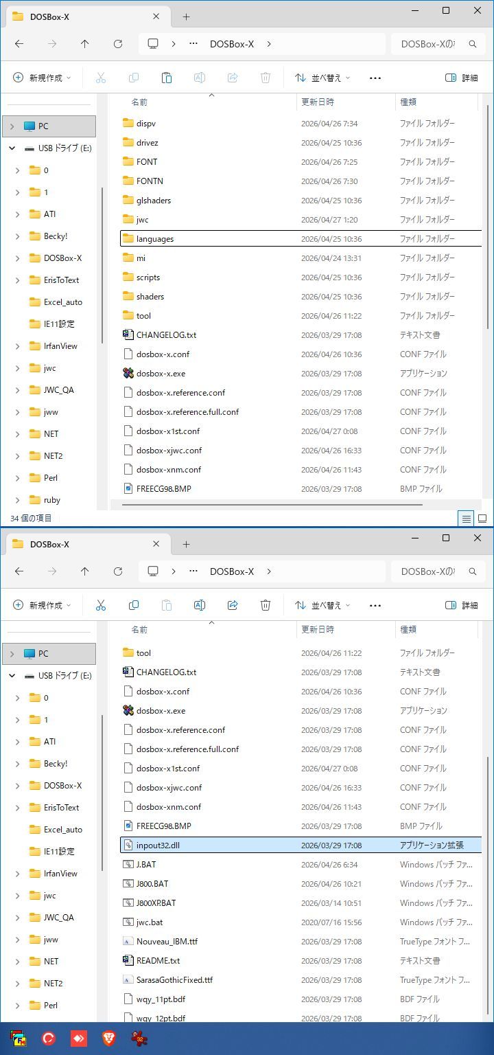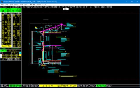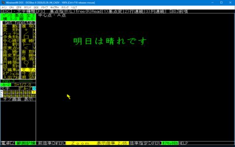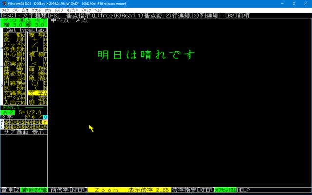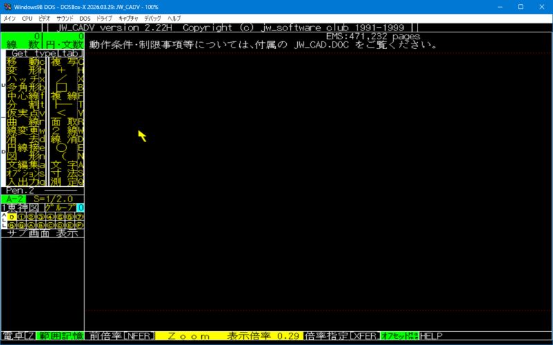 DOSBox-X DOSBoxでは手順が大変でしたが今回紹介する DOSBox-X は 解凍したフォルダの dosboxj.conf を少し変更するだけでDOS版JW_CADが動作します。 日本語入力と800x600表示も可能です。 作図作業にも耐えられるのではと思います。(ベテランの方は違和感感じるかも) 2026/04/26 注意点は 日本語自動 ON/OFF が聞かないので手動で左上の半角/全角キーで切り替える必要があります。2026/04/26 32-bit Portable: 9x/NT4+ (現時点 2026/04/26) 今回は、DOSBox-X を使用します。 日本語対応(日本語入力可能)で、マウスドライバーを組み込まれています。 DOSBox-Xは、DOS/Vユーザーモードをエミュレートするソフトです。 インストール DOSBox-Xの実行 マウント DOS版JW_CADの準備 DOS版JW_CAD動作検証 Windows 10/11で DOS版JW_CAD(DOS/V) を使用するには, DOSBox-X という、DOS エミュレータが必要になる。 DOS っていうのは、Windows が登場する前の OS です。 XP 以降は NT ベースになったため、DOS は無くなってしまった。 64bit OS を使っていると、さすがに動かない。エミュレータが必要になる。 DOS エミュレータは最初から DOS を動かす前提で作られている。 DOSBox/DOSBox-X が他のエミュレータと違うのは、Windows のディレクトリを 「そのまま」ディスクとしてマウント出来ることだ。 DOSBoxの日本語化は、DOSBox 0.74 106 jp キーボード対応版 から入手可能 ( dosbox-r3850-jp : https://www.wizforest.com/trash/dosbox/ ) 今回は、DOSBox-X を使用します。 日本語対応(日本語入力可能)で、マウスドライバーを組み込まれています。 https://dosbox-x.com/ にアクセスして 32-bit Portable: 9x/NT4+ を入手 ( dosbox-x-hx-dos-2026.03.29.zip ) Windows の C: ドライブに \DOSBox-x というディレクトリを作る。 C:\DOSBox-X に dosbox-x-hx-dos-2026.03.29.zip を全て解凍する。 dosbox-x.exe と同じディレクトリに、dosbox.conf というファイルがある。 とりあえず中身はあまり気にしないで、一番下を見ると [autoexec] という セクションがあって、当初は何も書かれていない。 ここにコマンドを書くと、起動時に自動的に実行される。 だから、ここに mount c c:\DOSBox-X c: と追加すると、起動直後に c: ドライブのルートにいる形になる。 これだけでは日本語は表示できない。 DOS/V の日本語表示は、 「フォントドライバ」と「ディスプレイドライバ」に必須です。 フォントドライバは、フォントファイルを読み込んでフォントを提供する。 フォントが無いと何もできない。 ディスプレイドライバは、このフォントを使って画面を表示するのだけど、 「英語モード」と「日本語モード」がある。 フリーのフォントドライバ、ディスプレイドライバ、フォント、モード切替 ソフトが必要となる。 DOSBox-X には、デバイスドライバを組み込む方法が用意されていない。 日本語表示のする「デバイスドライバ」は、OS を拡張するアプリケーション。 フォントドライバー FONTX と ディスプレイドライバ DISPVは下記より入手 ( fontn10.lzh / disp160a.lzh ) https://www.nanshiki.co.jp/software/etcdos.html c:\DOSBox-X\ の下にDISPV ディレクトリを作って c:\DOSBox-X\DISPV に disp160a.lzh を全て解凍する。 c:\DOSBox-X\ の下にFONTN ディレクトリを作って c:\DOSBox-X\FONTN に fontn10.lzh を全て解凍する。 16dot フォント を入手する。 ( 平木敬太郎フォント : http://homepage3.nifty.com/silo/FONTV/ ) X68k 用に作られたフリーフォントを、DOS/V 用にコンバートして配布している。 個人的には小伝馬町16が使いやすいので、16dot フォントであればお好みで。 ( VGON16.LZH ) c:\DOSBox-X\ の下にFONT ディレクトリを作って c:\DOSBox-X\FONT に全て解凍する。 GONHN16X.TLF GONHN19X.TLF GONZN16X.TLF Natrium 氏作の画面モード変更プログラム CHEJ を入手 ( chej610.lzh ) https://www.vector.co.jp/soft/dos/util/se004219.html 日本語と英語を切り替えるのに使うソフト。 最初は英語環境で始まるので、このソフトが無いと日本語を表示できない。 中身を、c:\DOSBox-X\TOOL に chej610.lzh を解凍する。 CHEJ.DOC CHEJ.EXE CHEJ.INI CHEJ610.DOC フォント組み込むファイルがそろったので設定ファイルを作成する。 フォントドライバに読み込ませるフォントを設定しないといけない。 c:\DOSBox-X\FONT\ の下(小伝馬町を解凍したところ)に、 FONTN.INI を作る。内容は以下の通り。 [CODE] ; Define code area. F040 F0FC ; user font area [FONT] ; Install font file. GONHN16X.TLF GONHN19X.TLF GONZN16X.TLF [CODE] 以下は、外字領域を指定している。 [FONT] 以下の内容は、先ほど展開した小伝馬16 のファイル名3つを追加。 HN16 は、縦16ドットの半角アスキーフォント。 HN19 は、縦19ドットの半角アスキーフォント。 ZN16 は、縦16ドットの全角日本語フォント。 これで、日本語を表示する準備は完了。 いま入れたソフト群を使えるように、dosbox.conf の autoexec を追記する。 (さっき書いた、mount して c: する下に続ける) 補足) c:\DOSBox-X\からの相対指定となる。 \fontn\fontnx /P=c:\font\ \dispv\dispva \tool\chej jp \dispv\vmx 70 フォントを組み込んで、ディスプレイドライバを組み込んで、 日本語モードにし、縦 37行モードにしている。 ちなみに、\chej\chej us とすれば英語に戻る。 \dispv\vmx 3 とすると、縦 37行モード