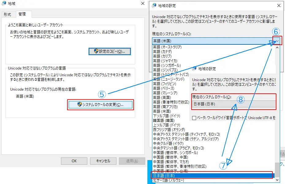 OK をクリックする。 - システムロケールの変更(C) をクリックする。