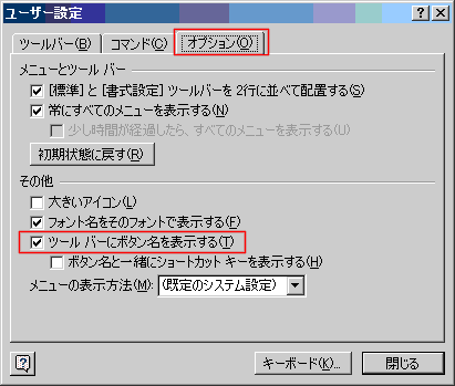- 「ツールバーにボタン名を表示する」にチェックを入れます。