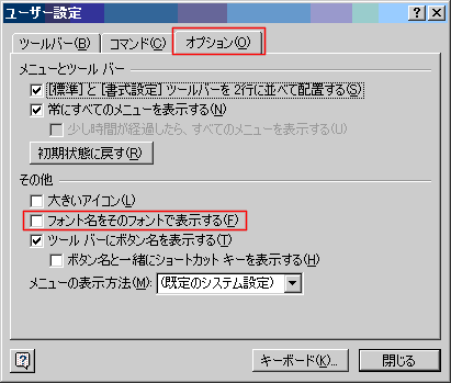 - 「フォント名をそのフォントで表示する」のチェックを入れると、標準の状態になります。