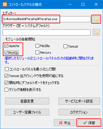 MySQL の文字背景が緑色に変更し、ログにも「running(起動中)」と表示されたら、