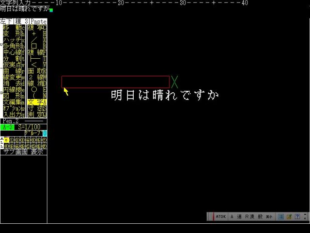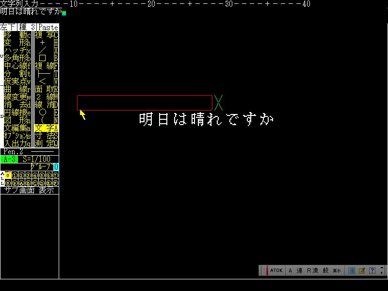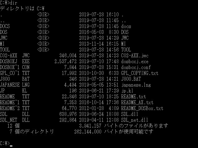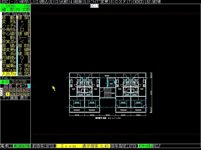 DOSBox-X DOSBoxでは手順が大変でしたが今回紹介する DOSBox-X は 解凍したフォルダの dosboxj.conf を少し変更するだけでDOS版JW_CADが動作します。 日本語入力と800x600表示も可能です。 作図作業にも耐えられるのではと思います。(ベテランの方は違和感感じるかも) 2026/04/26 注意点は 日本語自動 ON/OFF が聞かないので手動で左上の半角/全角キーで切り替える必要があります。2026/04/26 32-bit Portable: 9x/NT4+ (現時点 2026/04/26) 今回は、DOSBox-X を使用します。 日本語対応(日本語入力可能)で、マウスドライバーを組み込まれています。 DOSBox-Xは、DOS/Vユーザーモードをエミュレートするソフトです。 インストール DOSBox-Xの実行 マウント DOS版JW_CADの準備 DOS版JW_CAD動作検証 Windows 10/11で DOS版JW_CAD(DOS/V) を使用するには, DOSBox-X という、DOS エミュレータが必要になる。 DOS っていうのは、Windows が登場する前の OS です。 XP 以降は NT ベースになったため、DOS は無くなってしまった。 64bit OS を使っていると、さすがに動かない。エミュレータが必要になる。 DOS エミュレータは最初から DOS を動かす前提で作られている。 DOSBox/DOSBox-X が他のエミュレータと違うのは、Windows のディレクトリを 「そのまま」ディスクとしてマウント出来ることだ。 DOSBoxの日本語化は、DOSBox 0.74 106 jp キーボード対応版 から入手可能 ( dosbox-r3850-jp : https://www.wizforest.com/trash/dosbox/ ) 今回は、DOSBox-X を使用します。 日本語対応(日本語入力可能)で、マウスドライバーを組み込まれています。 https://dosbox-x.com/ にアクセスして 32-bit Portable: 9x/NT4+ を入手 ( dosbox-x-hx-dos-2026.03.29.zip ) Windows の C: ドライブに \DOSBox-x というディレクトリを作る。 C:\DOSBox-X に dosbox-x-hx-dos-2026.03.29.zip を全て解凍する。 dosbox-x.exe と同じディレクトリに、dosbox.conf というファイルがある。 とりあえず中身はあまり気にしないで、一番下を見ると [autoexec] という セクションがあって、当初は何も書かれていない。 ここにコマンドを書くと、起動時に自動的に実行される。 だから、ここに mount c c:\DOSBox-X c: と追加すると、起動直後に c: ドライブのルートにいる形になる。 これだけでは日本語は表示できない。 DOS/V の日本語表示は、 「フォントドライバ」と「ディスプレイドライバ」に必須です。 フォントドライバは、フォントファイルを読み込んでフォントを提供する。 フォントが無いと何もできない。 ディスプレイドライバは、このフォントを使って画面を表示するのだけど、 「英語モード」と「日本語モード」がある。 フリーのフォントドライバ、ディスプレイドライバ、フォント、モード切替 ソフトが必要となる。 DOSBox-X には、デバイスドライバを組み込む方法が用意されていない。 日本語表示のする「デバイスドライバ」は、OS を拡張するアプリケーション。 フォントドライバー FONTX と ディスプレイドライバ DISPVは下記より入手 ( fontn10.lzh / disp160a.lzh ) https://www.nanshiki.co.jp/software/etcdos.html c:\DOSBox-X\ の下にDISPV ディレクトリを作って c:\DOSBox-X\DISPV に disp160a.lzh を全て解凍する。 c:\DOSBox-X\ の下にFONTN ディレクトリを作って c:\DOSBox-X\FONTN に fontn10.lzh を全て解凍する。 16dot フォント を入手する。 ( 平木敬太郎フォント : http://homepage3.nifty.com/silo/FONTV/ ) X68k 用に作られたフリーフォントを、DOS/V 用にコンバートして配布している。 個人的には小伝馬町16が使いやすいので、16dot フォントであればお好みで。 ( VGON16.LZH ) c:\DOSBox-X\ の下にFONT ディレクトリを作って c:\DOSBox-X\FONT に全て解凍する。 GONHN16X.TLF GONHN19X.TLF GONZN16X.TLF Natrium 氏作の画面モード変更プログラム CHEJ を入手 ( chej610.lzh ) https://www.vector.co.jp/soft/dos/util/se004219.html 日本語と英語を切り替えるのに使うソフト。 最初は英語環境で始まるので、このソフトが無いと日本語を表示できない。 中身を、c:\DOSBox-X\TOOL に chej610.lzh を解凍する。 CHEJ.DOC CHEJ.EXE CHEJ.INI CHEJ610.DOC フォント組み込むファイルがそろったので設定ファイルを作成する。 フォントドライバに読み込ませるフォントを設定しないといけない。 c:\DOSBox-X\FONT\ の下(小伝馬町を解凍したところ)に、 FONTN.INI を作る。内容は以下の通り。 [CODE] ; Define code area. F040 F0FC ; user font area [FONT] ; Install font file. GONHN16X.TLF GONHN19X.TLF GONZN16X.TLF [CODE] 以下は、外字領域を指定している。 [FONT] 以下の内容は、先ほど展開した小伝馬16 のファイル名3つを追加。 HN16 は、縦16ドットの半角アスキーフォント。 HN19 は、縦19ドットの半角アスキーフォント。 ZN16 は、縦16ドットの全角日本語フォント。 これで、日本語を表示する準備は完了。 いま入れたソフト群を使えるように、dosbox.conf の autoexec を追記する。 (さっき書いた、mount して c: する下に続ける) 補足) c:\DOSBox-X\からの相対指定となる。 \fontn\fontnx /P=c:\font\ \dispv\dispva \tool\chej jp \dispv\vmx 70 フォントを組み込んで、ディスプレイドライバを組み込んで、 日本語モードにし、縦 37行モードにしている。 ちなみに、\chej\chej us とすれば英語に戻る。 \dispv\vmx 3 とすると、縦 37行モード
